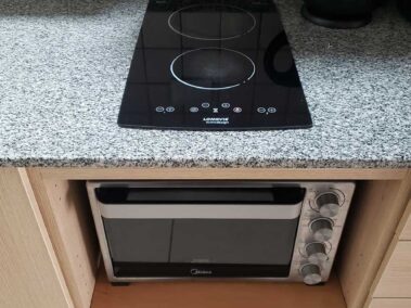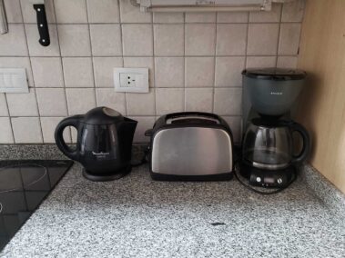 - Cocina eléctrica totalmente equipada, vajilla completa, cafetera y heladera.