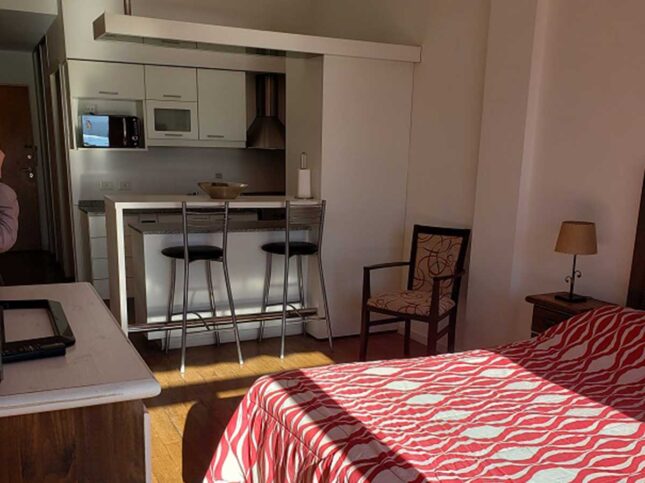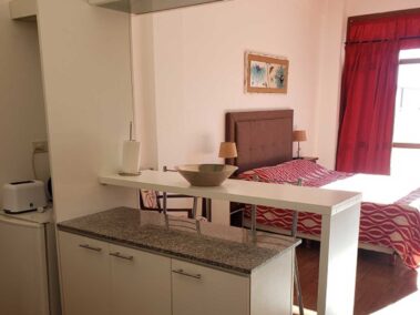 - Cocina a gas totalmente equipada con microondas y heladera, tostador y pava eléctrica