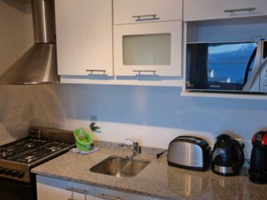 - Cocina a gas totalmente equipada con microondas y heladera, tostador, pava eléctrica