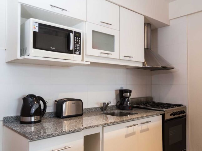 - Cocina a gas totalmente equipada con microondas y heladera, tostador, pava eléctrica